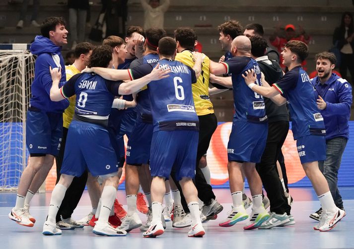 Íslenska karlalandsliðið hefur aldrei mætt Ítalíu áður á stórmóti og Ítalir eru á sínu fyrsta Evrópumóti á þessari öld. Þeir hafa einu sinni áður verið með eða á EM á heimavelli árið 1998. Ítalska landsliðið var aftur á móti með á HM fyrir ári síðan þar sem liðið endaði í öðru sæti í sínum riðli og komst áfram í milliriðilinn. Fara nýjar leiðir í taktík Ítalska liðið tapaði reyndar með nítján marka mun á móti Dönum en vann hina tvo leiki sína á móti Túnis og Alsír. Liðið vann síðan einn leik í milliriðli sem var á móti Tékkum. Þjóðverjinn Bob Hanning þjálfar ítalska landsliðið og hefur verið að fara nýjar leiðir síðan hann tók við liðinu fyrir ári síðan. Gott dæmi um það er að spila ekki með línumann og vera frekar með fjóra leikmenn fyrir utan í staðinn auk hornamannanna tveggja. Hanning er þekktastur fyrir tengsl sín við Füchse Berlin þar sem hann hjálpaði til við að byggja upp stórveldið. Hanning hefur sjálfur notað gælunafnið „Napóleon“, sem hann fékk vegna vaxtar síns, útlits og framkomu, með því að birta myndir af sjálfum sér í búningum Napóleons. Bob Hanning lætur oft vel í sér heyra á hliðarlínunni.Getty/City-Press Hann er óhræddur við að fara sínar leiðir og er jafnframt þekktur fyrir að vinna með og uppgötva unga leikmenn. Hann var tilbúinn að veðja á Ítalíu-verkefnið og taka við liði sem var þekkt fyrir eitthvað allt annað en að vera með á stórmótum. Æfingar teknar upp af „sjö eða átta myndavélum Í nóvember bauð hann liðinu í æfingabúðir í „Füchsetown“, æfingaaðstöðu ríkjandi Þýskalandsmeistara Füchse Berlin. Hver einasta æfing var tekin upp af „sjö eða átta myndavélum, sem sýndu strákunum upp á sentimetra hvar þeir ættu að sækja á vörnina. „Ég held að mörg landslið vinni ekki svona,“ sagði Domenico Ebner, markvörður ítalska landsliðsins, í viðtali við heimasíðu EHF. Ég hafði ekki séð það áður Leikmennirnir hafa þegar tileinkað sér þessa nákvæmu nálgun: „Nú til dags sér maður leikmenn sitja saman í þriggja eða fjögurra manna hópum í æfingabúðum og ræða taktík og hvernig eigi að leysa vandamál. Ég hafði ekki séð það áður. Það er vissulega líka Bob að þakka,“ sagði Ebner. Að þróa leikstíl liðsins er ein hlið ráðningar Hannings. Sambandið vonast einnig til að hagnast á tengslum Hannings víðs vegar um Evrópu, sem gæti hjálpað fleiri ítölskum leikmönnum að spila erlendis, auk þess að auka fagmennsku í umgjörð landsliðsins. Leikmenn ítalska landsliðsins fagna langþráðu sæti á EM.Getty/Alessandro Tocco/ Förum þangað til að vinna alla þrjá leikina Það eru engir auðveldir riðlar eða andstæðingar á EM – eitthvað sem Hanning veit mætavel. Engu að síður hefur hann sett liði sínu metnaðarfull markmið: „Það er hægt að tapa fyrir Íslandi, Ungverjalandi og Póllandi – það er engin spurning. En við förum þangað til að vinna alla þrjá leikina,“ sagði Bob Hanning. Hanning tileinkar sér hugarfarsbreytinguna sem hann vill innleiða hjá sambandinu. „Við ætlum ekki að segja að við séum þessi „litla Ítalía“. Nei – við stefnum á milliriðil,“ sagði Hanning. Óþægilegt lið að spila á móti Ebner tekur undir þessi markmið: „Við getum verið óþægilegt lið að spila á móti. Við höfum nokkra möguleika í sókninni, getum spilað einn á einn með fjórum útileikmönnum, en höfum líka hávaxnari leikmenn í liðinu til að skjóta af löngu færi,“ sagði Ebner. Þessir eiginleikar, ásamt ítalska hugarfarinu, ítalska hjartanu sem hættir aldrei að berjast og fjölskylduanda liðsins, ættu að tryggja árangur á mótinu, að sögn Ebner. Þjálfarinn og markvörðurinn hafa svipað hugarfar þegar kemur að því að lýsa því hvað teljist árangur fyrir liðið. Með fallegum og aðlaðandi handbolta „Þegar við förum úr leikjunum með þá tilfinningu að við höfum gefið allt í þá, höfum við náð því sem við ætluðum okkur,“ sagði Ebner. Hanning bætir við: „Ég get sagt þér að ég vil vinna hvern einasta leik, sama hvenær eða hvar. Fyrir mér er mótið árangursríkt þegar við náum því sem við ætluðum okkur yfir marga leiki og veitum fólki innblástur með fallegum og aðlaðandi handbolta,“ sagði Hanning. Það verður því hugarfarspróf fyrir strákana okkar að spila við ítalska landsliðið í fyrsta leik EM 2026.
