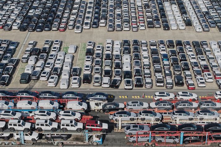 Kína hefur ekki verið með viðskiptahalla frá árinu 1993. Útflutningur frá Kína jókst um 5,5 prósent á milli ára, þrátt fyrir tolla Donalds Trump, forseta Bandaríkjanna, gegn Kína en margir hagfræðingar bjuggust við því að þeir myndu koma niður á útflutningi frá Kína. Samkvæmt frétt Wall Street Journal dróst útflutningur frá Kína til Bandaríkjanna saman um tuttugu prósent á milli ára en Kínverjar fundu nýja viðskiptavini annars staðar í heiminum sem endaði með áðurnefndum viðskiptaafgangi upp á 150 billjónir króna (150.000.000.000.000). Útflutningur Kína til Suðaustur-Asíu jókst um þrettán prósent. Útflutningur til Evrópu jókst um 8,4 prósent og útflutningur til Suður-Ameríku jókst um 7,4. Langmest aukning var þó þegar snýr að Afríku en aukningin var heil 26 prósent. Í frétt New York Times segir að útflutningur frá Kína til annarra heimssvæða hafi að miklu leyti endað í Bandaríkjunum. Innflytjendur þar hafi notað milliliði til að komast hjá tollum Trumps. Þá hefur lækkun í virði gjaldmiðils Kína einnig gert útflutning auðveldari, þar sem vörur þaðan eru ódýrari og innflutningur dýrari. Kínverjar selja sífellt fleiri rafmagnsbíla í heiminum.AP/Chinatopix Sagðir treysta of mikið á útflutning Innflutningur Kínverja stóð svo gott sem í stað á milli ára en ráðamenn þar hafa lagt mikla áherslu á að auka sjálfbærni í fjölmörgum geirum. Greinendur hafa um nokkurt skeið haft áhyggjur af hagkerfi Kína og þá sérstaklega vegna þess hve mikið hann reiðir á útflutning. Alþjóðagjaldeyrissjóðurinn hefur til að mynda varað við því og sagt að hagkerfið, sem er það annað stærsta í heiminum, sé of stórt til að treysta á útflutning. Aðrir, bæði utan landamæra Kína og innan þeirra, hafa kallað eftir því að meiri áhersla verði lögð á neyslu. Framleiðsla og útflutningur hafa aukist til muna í ríkinu en fasteignakerfið og neysla heimila hefur dregist á eftir. Fasteignahrun í Kína hefur á undanförnum árum þurrkað út sparnað margra og kaupmáttur margra kínverskra fjölskyldna hefur dregist saman hvort sem snýr að innfluttum vörum eða vörum framleiddum í Kína.