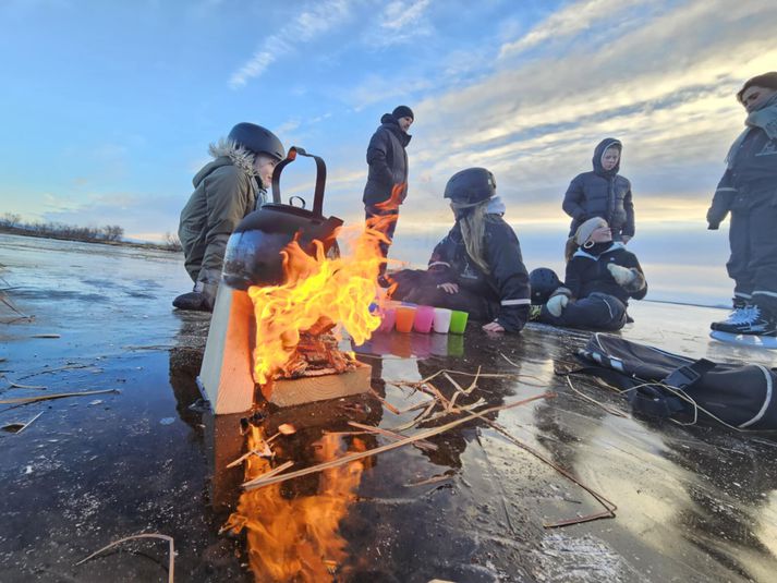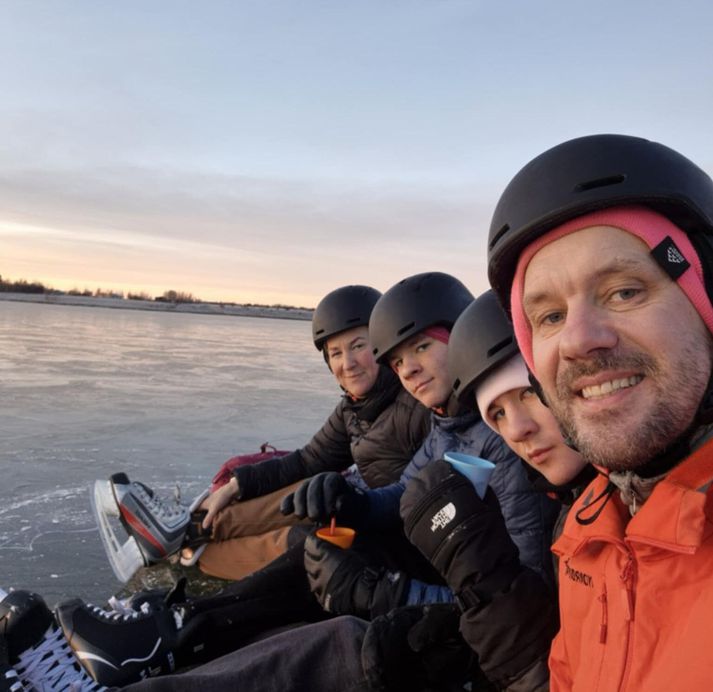 Skautafjörið hófst klukkan 12:00 og stendur formlega til 14:00 í dag en öllum er heimild að vera áfram á vatninu og skauta og leika sér fram eftir degi. Það er heilsueflandi Bláskógabyggð og heilsueflandi Grímsnes-og Grafningshreppur, svæðisskrifstofa íþróttahéraða á Suðurlandi og Héraðssambandið Skarphéðinn, sem standa fyrir viðburðinum. Hallbera Gunnarsdóttir, sem er útivistakennari á Laugarvatni er ein af skipuleggjendum dagsins en hann er hluti af Evrópsku vetrar íþróttavikunni. „Við ætlum bara að hafa skauta í boði fyrir fólk, sem vill koma og prófa og svo náttúrulega kveikjum við eld ef einhver vill koma og grilla sér pylsur eða hita kakó eða eitthvað og svo erum við með ísbor og einhverjir hafa nú áhuga á að dorga en það er fullt af fiski undir ísnum, sem maður sér þegar maður er að skauta yfir,” segir Hallbera og bætir við. „Vatnið er bara algjör paradís og æðislegt að búa hér og bara hvernig veðrið hefur verið því maður veit aldrei og getur aldrei planað neitt hvað þetta varðar með miklum fyrirvara.” Hallbera Gunnarsdóttir, útivistakennari á Laugarvatni með fjölskyldu sinni á skautum á Laugarvatni en Smári Stefánsson, eiginmaður hennar er hér með henni og synir þeirra, Logi og Friðrik.Aðsend Hallbera segir alveg öruggt að skauta á Laugarvatni og svellið þar hafi sjaldan eða aldrei litið eins vel út og núna. Og þetta að lokum frá Hallberu. „Já, bara allir út að skauta, það er ógeðslega gott veður og það eru hlýindi aðeins í kortunum fram undan þannig að ég veit ekki hversu lengi þetta endist, þannig að nýtum daginn.” Hægt verður að hita sér kakó á vatninu fyrir þá, sem það vilja.Aðsend