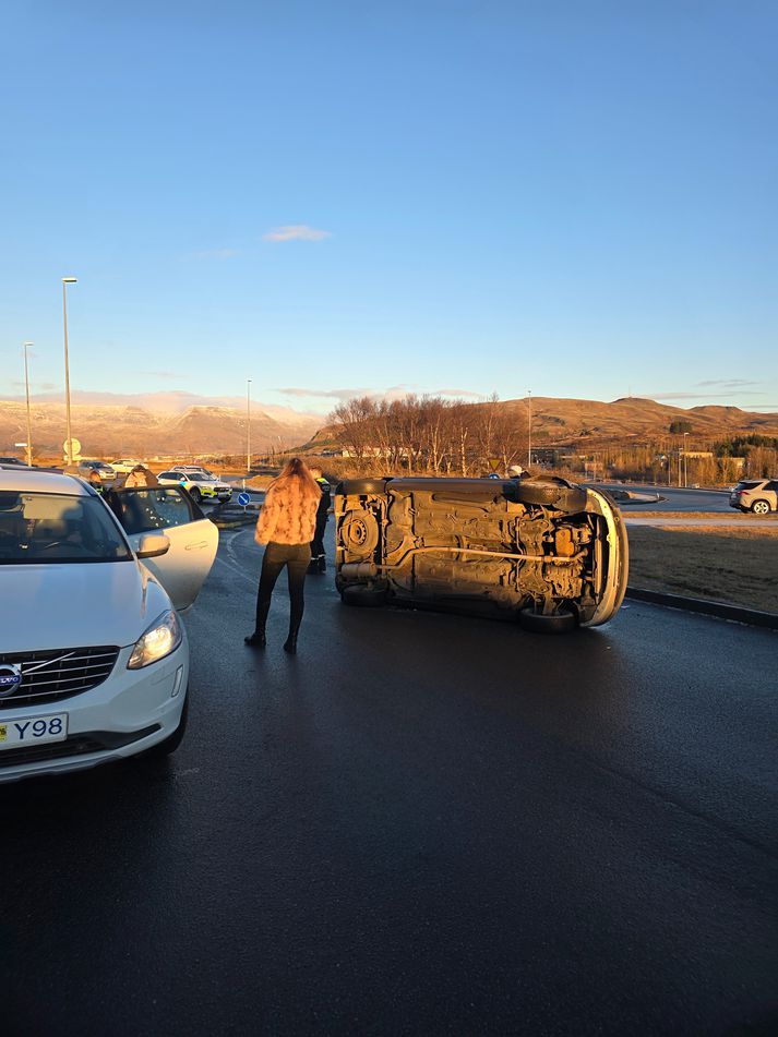 Einn endaði á hliðinni og þrjú klemmdust á milli Rafn Ágúst Ragnarsson skrifar 17. janúar 2026 10:57 Vetrarsólin getur verið hættuleg. Aðsend Betur fór en á horfðist þegar ökumaður, sem lág staða sólar á himni hafði blindað, ók á fleygiferð aftan á kyrrstæðan bíl í vegkanti, sem hafði örfáum mínútum fyrr ekið aftan á annan kyrrstæðan bíl þar fyrir framan, með þeim afleiðingum að fyrsti bíllinn hafnaði á hliðinni, og sá seinni skall utan í ökumenn og farþega beggja síðarnefndu bílanna, þar sem þeir stóðu og fylltu út tjónaskýrslu. Sigurjón Jónsson var í fremsta bílnum ásamt konu sinni og barni og segist hafa numið staðar á gatnamótum í Grafarvogi til að hleypa gangandi vegfaranda yfir þegar atburðarásin fór í gang. Sólin hafi verið mjög lág að lofti, þannig að hún skein beint í augun á ökumönnum og birgði þeim sýn. Viðbragðsaðilar komu á vettvang.Aðsend Hann segir seinni bílinn þá hafa ekið aftan á sig og báða ökumennina hafa í kjölfarið farið út í vegkant til að fylla út tjónaskýrslu. Þar stóðu þau á milli bílanna. Það var þá sem ungur maður kom á fleygiferð niður götuna, algjörlega blindaður af sólinni, ók á miklum hraða aftan á aftari bílinn, þannig að hann flykktist fram og skall utan í fólkið sem stóð bílanna á milli. Bíll unga mannsins hafnaði svo á á veginum miðjum. Enginn reyndist mikið slasaður.Aðsend Allt fór vel miðað við kringumstæðurnar en allt var fólkið flutt á sjúkrahús til aðhlynningar. Slysin reyndust minniháttar og til allrar lukku var barnið í barnastól aftur í fremsta bílnum og slapp þannig við havaríið. Samgönguslys Reykjavík Mest lesið Önnur stúlka með móður sinni þegar Högni var klófestur Innlent Var í símanum við neyðarlínuna þegar ekið var aftan á hann Innlent Danmörk „pínulítið land“ með „pínulítinn her“ Erlent „Hef hvergi hallað réttu máli“ Innlent Fimm bíla árekstur á Reykjanesbraut og tveir fluttir á slysadeild Innlent Einn endaði á hliðinni og þrjú klemmdust á milli Innlent Umfangsmikil lögregluaðgerð við Glerárgötu á Akureyri Innlent Ákvörðunin á ábyrgð stjórnenda Icelandair en ekki flugmanna Innlent Eigum eftir að sjá hvort Guðbrandur bæti upp fyrir hegðun sína Innlent Borgarstjóri fór með rangt mál Innlent Fleiri fréttir Skautafjör á Laugarvatni í dag „Biðröðin er löng“ Viðvarandi óvissuástand bitni á langtímaáætlunum fyrirtækja Einn endaði á hliðinni og þrjú klemmdust á milli Var í símanum við neyðarlínuna þegar ekið var aftan á hann Ákvörðunin á ábyrgð stjórnenda Icelandair en ekki flugmanna „Hef hvergi hallað réttu máli“ Önnur stúlka með móður sinni þegar Högni var klófestur Fá þau að vera aftur á lista með Hildi? Fimm bíla árekstur á Reykjanesbraut og tveir fluttir á slysadeild Eigum eftir að sjá hvort Guðbrandur bæti upp fyrir hegðun sína Umfangsmikil lögregluaðgerð við Glerárgötu á Akureyri Öryrkjar eru með hærri laun en eldri borgarar Borgarstjóri fór með rangt mál Gagnrýnin hugsun skipti máli Krafa um að Margrét Löf verði gerð arflaus fer fyrir Landsrétt Hófu niðurrif á félagsheimilinu í leyfisleysi: „Skaðinn er skeður“ Fjórir slást um oddvitasæti Viðreisnar Afsögn þingmanns, hótanir Trumps og í beinni frá Svíþjóð Mun hærri dánartíðni og meiri örorka hjá fyrrum vöggustofubörnum „Í mínum huga eru þetta klárar ærumeiðingar“ Vilja Laugardalshöll líkt og þeim var lofað Kviknaði í Svarta sauðnum í Þorlákshöfn Taldi ekki sérstaka nauðsyn á að hneppa Helga Bjart í varðhald Barbara sakar Sigríði um einelti og Valtý um gagnaleka „Vonbrigði“ Vill „nánast loka alfarið“ á útlendinga utan Evrópu Mjög óalgengt að þingmenn segi af sér Mikilvægt að vanda sig og beita varúð Telur Pétur hafa svarað ágætlega fyrir lóðaviðskipti Sjá meira