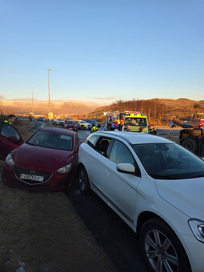 Sigurjón Jónsson var í fremsta bílnum ásamt konu sinni og barni og segist hafa numið staðar á gatnamótum í Grafarvogi til að hleypa gangandi vegfaranda yfir þegar atburðarásin fór í gang. Sólin hafi verið mjög lág að lofti, þannig að hún skein beint í augun á ökumönnum og birgði þeim sýn. Viðbragðsaðilar komu á vettvang.Aðsend Hann segir seinni bílinn þá hafa ekið aftan á sig og báða ökumennina hafa í kjölfarið farið út í vegkant til að fylla út tjónaskýrslu. Þar stóðu þau á milli bílanna. Það var þá sem ungur maður kom á fleygiferð niður götuna, algjörlega blindaður af sólinni, ók á miklum hraða aftan á aftari bílinn, þannig að hann flykktist fram og skall utan í fólkið sem stóð bílanna á milli. Bíll unga mannsins hafnaði svo á á veginum miðjum. Enginn reyndist mikið slasaður.Aðsend Allt fór vel miðað við kringumstæðurnar en allt var fólkið flutt á sjúkrahús til aðhlynningar. Slysin reyndust minniháttar og til allrar lukku var barnið í barnastól aftur í fremsta bílnum og slapp þannig við havaríið.