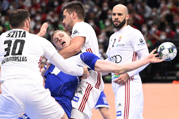 Liðin eru örugg um sæti í milliriðli og taka þangað með sér stigin úr leiknum annað kvöld. Sem sagt tvö, eitt eða engin stig. Ítalía og Pólland reyndust ekki mikil fyrirstaða fyrir þau, þó að sigrar Íslands hafi verið stærri og meira sannfærandi, og það var svo sem vitað fyrir fram að slagur Íslands og Ungverjalands yrði fyrsta skrefið í átt að undanúrslitum. Þangað ætla Ungverjar að komast, rétt eins og Íslendingar, og þeim hefur gengið vel gegn Íslandi undanfarin ár. Ísland hafi mætt með mjög sterkan hóp Ungverjar unnu 30-28 sigur í sömu höll og spilað verður nú, í Kristianstad, þegar liðin mættust á HM 2023. Á EM í Þýskalandi fyrir tveimur árum vann Ungverjaland átta marka sigur, 33-25, en Ísland vann 31-30 þegar liðin mættust í Búdapest á EM 2022. „Þeir sem hafa séð íslenska liðið í fyrstu tveimur leikjunum eru sammála mér um að þeir mættu hingað með mjög sterkan hóp. Þeir eru sigurstranglegri fyrir fram en það er engin ástæða til að óttast það,“ sagði Bence Imre, hægri hornamaður Ungverja og Kiel. Ísland og Ungverjaland hafa marga hildi háð síðustu ár. Ómar Ingi Magnússon og félagar fögnuðu sigri þegar liðin mættust á EM 2022, í Búdapest.EPA/Tamas Kovacs „Ég held að ungverska og íslenska liðið séu áþekk að getu. Eitt er alveg á hreinu og það er að við ættum ekki að dvelja í fortíðinni. Sigurinn í München fyrir tveimur árum er dásamleg minning en hefur enga þýðingu á þriðjudaginn. Þeir ættu frekar að vera hræddir en við. Ef við vinnum tökum við risaskref í átt að því að láta draum okkar rætast. En við leikmennirnir verðum að vera mun, mun nákvæmari inni á vellinum,“ sagði Imre við Magyar Nemzet. Enn meiri orka fari í að mæta Íslendingum Línutröllið Adrián Sipos, sem spilar með Melsungen í Þýskalandi, er tilbúinn fyrir harðan slag við Íslendinga. „Þessir tveir leikir hafa tekið sinn toll af okkur en það er bara eðlilegt á Evrópumóti, þar sem spilað er annan hvern dag og tíminn í endurheimt er mjög takmarkaður. Ísland er líklegast til að vinna riðilinn. Þeir eru meira í að sækja „einn á einn“ en Ítalir eða nokkur önnur þjóð, því þeirra taktík gengur út á það, svo það krefst enn meiri orku frá okkur en fyrstu tveir leikirnir. En þetta er ekki fyrsta stórmótið okkar og ég geri þetta í hverri viku í Þýskalandi, svo ég held enn að það sé þannig að ef hausinn verður í lagi hjá okkur þá mun líkaminn höndla þetta,“ sagði Sipos.