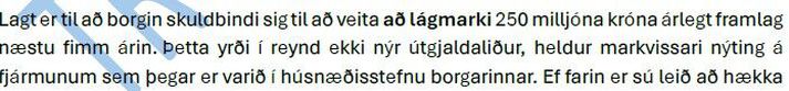 Meirihluti borgarstjórnar samþykkti á borgarstjórnarfundi í gær að borgin skuldbindi sig til að veita Félagsbústöðum fjárframlög næstu fimm ár upp á samtals um 2,4 milljarða króna. Þrjú hundruð milljónir séu vegna síðasta árs. Minnihlutinn í borginni gagnrýnir harðlega að við ákvörðun meirihlutans hafi ekki verið birt ný skýrsla um fjárhagsstöðu Félagsbústaða og tillögur til úrbóta. Heiða B. Hilmisdóttir greindi frá því í hádegisfréttum Bylgjunnar að það hafi ekki verið hægt að birta hana því hún sé í umsagnarferli. Kolsvört skýrsla Fréttastofa hefur skýrsluna sem ber heitið, Frá skuldsettum vexti til sjálfbærni, undir höndum sem sérfræðingar frá Reykjavíkurborg og framkvæmdastjóri Félagsbústaða eru skrifaðir fyrir. Þar er farið yfir þrönga fjárhagsstöðu félagsins. Veltufé standi naumlega undir afborgunum og viðhaldi. Ef ekki komi til raunhækkunar á leiguverði eða sérstaks eiginfjárframlags frá eiganda skapist hætta á greiðsluerfiðleikum. Úr skýrslu starfshóps borgarstjórnar um fjárhagstöðu Félagsbústaða sem minnihlutinn í borgarstjórn gagnrýnir að hafi ekki verið gerð opinber,Vísir Meirihlutinn tvöfaldaði lágmarksupphæðina Í skýrslu starfshópsins koma fram sjö tillögur um hvernig hægt sé að laga rekstrarskilyrðin. Þeim sé ætlað að stöðva þann skuldadrifna vöxt sem hafi einkennt rekstur Félagsbústaða. Meðal þess sem lagt er til er að borgin skuldbindi sig til að veita að lágmarki 250 milljónum króna í árlegt framlag til Félagsbústaða næstu fimm árin. Þá eru kynntar fjórar sviðsmyndir til að hagræða í rekstrinum. Meirihlutinn í borgarstjórn ákvað að tvöfalda upphæðina sem lögð er til í skýrslunni á borgarstjórnarfundi í gær. Ákváðu í samstarfssáttmála að tvöfalda kaupin Heiða B. Hilmisdóttir borgarstjóri segir að meirihlutinn hafi ákveðið að fara aðrar leiðir en þar eru lagðar til. „Í samstarfssáttmála meirihlutans kom fram að við vildum tvöfalda kaup á félagslegu húsnæði. Þannig að þetta er leið til þess. Nú er mér falið að skoða nýtingu fjármagnsins með Félagsbústöðum,“ segir Heiða í samtali við fréttastofu um málið. Aðspurð um hvort tillaga meirihlutans vegna Félagsbústaða sé önnur en komi fram í skýrslu starfshópsins svarar Heiða því játandi. „Já, það eru nokkrar sviðsmyndir sem eru lagðar fram um framtíðaruppbyggingu og tilhögun á rekstri í skýrslunni,“ segir Heiða. Úr skýrslu starfshópsins. Vísir „Tel að hér sé um prófkjörsvíxil að ræða“ Kjartan Magnússon borgarfulltrúi Sjálfstæðisflokksins og stjórnarmaður Félagsbústaða segir að lengi hafa legið fyrir að félagið þurfi nauðsynlega að fá fjármagn í reksturinn en gerir alvarlegar athugasemdir við framgöngu meirihlutans í málinu og leyndina sem hvíli yfir skýrslu starfshópsins. „Við gagnrýnum þessa undarlegu málsmeðferð. Þetta er þriðja skýrslan sem hefur verið gerð um Félagsbústaði undanfarin ár en engin þeirra hefur verið gerð opinber. Málefnum Félagsbústaða hefur verið velt undan allt kjörtímabilið án aðgerða,“ segir Kjartan. Hann gerir athugasemd við að málið sé til afgreiðslu nú þegar nokkrir dagar eru í prófkjör Samfylkingarinnar í borginni. „Loksins núna þegar eru nokkrir dagar til prófkjörs Samfylkingarinnar samþykkir meirihlutinn tillögu um Félagsbústaði. Ekki er orðið við óskum um að afhenda skýrslur sem tengjast málinu. Ég tel að hér sé um prófkjörsvíxil að ræða. Með þessari ákvörðun er verið að skuldbinda borgarstjórn allt næsta kjörtímabil í málinu sem er óeðlilegt rétt fyrir kosningar,“ segir Kjartan. Aðspurður um að fréttastofa hafi skýrsluna þar sem komi fram tillaga um mun lægra fjárframlag til Félagsbústaða en meirihlutinn hafi svo ákveðið svarar Kjartan: „Auðvitað er mjög óeðlilegt að taka slíka ákvörðun þegar meirihluti borgarfulltrúa hefur ekki séð skýrsluna og tvær aðrar skýrslur sem hafa verið gerðar um Félagsbústaði á kjörtímabilinu. Aðeins borgarráð og Félagsbústaðir hafa fengið að sjá þær. Ég hefði talið lágmark að borgarfulltrúar fái að sjá allar þær skýrslur sem hafa verið gerðar um Félagsbústaði á kjörtímabilinu,“ segir Kjartan.