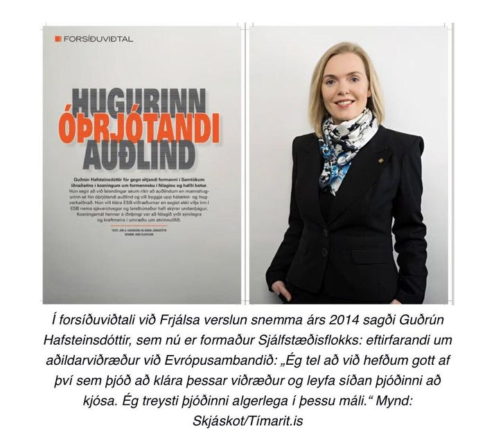 „Ég hræðist ekki þjóð mína, en ég sé enga ástæðu til að keyra landið inn í efnahagsumhverfi sem er lakara en okkar. Og ef það er eitthvað sem er eitur í mínum beinum, þá er það miðstýring og forsjárhyggja,“ segir hún í svari til Dags á Facebook-síðu hans en þar hafði hann rifjað upp, í grein í Morgunblaðinu, tólf ára gamalt viðtal við Guðrúnu þar sem hún sagðist hlynnt því að þjóðin fengi að segja sína skoðun á aðildarviðræðunum. Dagur rifjaði upp þetta viðtal við Guðrúnu í tímaritinu Frjálsrar verslunar árið 2014 þar sem hún sagðist styðja aðildarviðræður. Frjáls verslun/timarit.is Guðrún bendir á í svari sínu að þegar viðtalið var tekið hafi hún verið nýtekin við sem formaður Samtaka iðnaðarins og að viðræður hafi enn staðið yfir við Evrópusambandið. „Ég verð að viðurkenna að það eru heldur fátækleg rök þegar grafið er upp tólf ára gamalt viðtal til að skýra afstöðu mína í dag. Þarna var ég nýtekin við sem formaður Samtaka iðnaðarins, viðræður stóðu enn yfir, þjóðin var enn í áfalli eftir hrun og umræðan var í allt öðrum farvegi. Þá taldi ég eðlilegt að þjóðin fengi að segja sitt, enda voru skiptar skoðanir innan atvinnulífsins,“ segir Guðrún um þetta í svari sínu. Framsókn hræðist ekki atkvæðagreiðslu Tilefni upprifjunarinnar var grein sem Dagur skrifaði í Morgunblaðið í gær um framtíð aðildarviðræðna að Evrópusambandinu. Þar rifjaði hann upp að bæði Sjálfstæðisflokkurinn og Framsóknarflokkurinn hafi á sínum tíma verið hlynnt viðræðum og telur tilefni til að standa við þau loforð sem hafi verið gefin þá. Í færslunni, þar sem hann deilir greininni, fjallar hann svo einnig um það að hann hafi á mánudag verið gestur Silfursins á RÚV þar sem hann ræddi viðræðurnar ásamt Jens Garðari Helgasyni, varaformanni og þingmanni Sjálfstæðisflokksins, Maríu Rut Kristinsdóttur, þingkonu Viðreisnar, og Sigurði Inga Jóhannssyni, formanni og þingmanni Framsóknarflokksins. Sigurður Ingi lætur af störfum sem formaður flokksins um miðjan næsta mánuð þegar flokkurinn kýs sér nýjan formann. Vísir/Anton Brink Í þættinum sagði Sigurður Ingi að Framsóknarflokkurinn hræðist ekki þjóðina eða þjóðaratkvæðagreiðslu um aðildarviðræður að Evrópusambandinu. Hann sagði nauðsynlegt að spyrja hvort fólk ætlaði að ganga í sambandið því við tækju við aðlögunarviðræður, um kosti og galla. Það væru ýmsir gallar á þessu og það þyrfti að ræða þá heiðarlega. Jens Garðar var á öðrum nótum og sagði þetta ekki aðildarviðræður heldur aðlögunarviðræður. Hann sagði að frekar ætti að spyrja fólk um það hvort það vilji ganga í Evrópusambandið. María Rut tilheyrir Viðreisn sem styður aðild að Evrópusambandinu og hún sagði í þættinum nauðsynlegt að leiða þetta mál til lykta og því væri hún hlynnt því að atkvæðagreiðsla færi fram sem fyrst. Í grein sinni í Morgunblaðinu fór Dagur yfir stöðuna hvað varðar Evrópumálin. Kristrún Frostadóttir hafi sagt í viðtali við Morgunblaðið á árinu að rétti tíminn væri runninn upp til að hefja umræðu um þjóðaratkvæðagreiðslu um aðildarviðræður. Inga Sæland, formaður Flokks fólksins, hefur lýst því yfir að hún styðji slíka atkvæðagreiðslu en að hún styðji ekki aðild. Þá hefur Þorgerður Katrín Gunnarsdóttir utanríkisráðherra lýst því yfir að hún muni á vorþingi leggja fram þingsályktunartillögu um atkvæðagreiðslu um aðildarviðræður. Þjóðin hlynnt viðræðum Í stjórnarsáttmála ríkisstjórnarinnar er kveðið á um að slík atkvæðagreiðsla ætti að fara fram ekki síðar en 2027. Í byrjun janúar kom fram að samkvæmt könnun Maskínu er meirihluti landsmanna hlynntur upptöku viðræðna við Evrópusambandið. Könnunin var gerð í desember. Í tilefni af þessari könnun var rætt við Eirík Bergmann, prófessor í stjórnmálafræði. Í viðtali sagði hann líklegt að afstaða fólks væri að taka hröðum breytingum samhliða vendingum á alþjóðavísu. Gera mætti ráð fyrir algjörri uppstokkun í umræðu um kosti og galla aðildar.