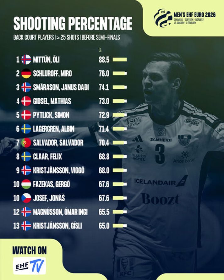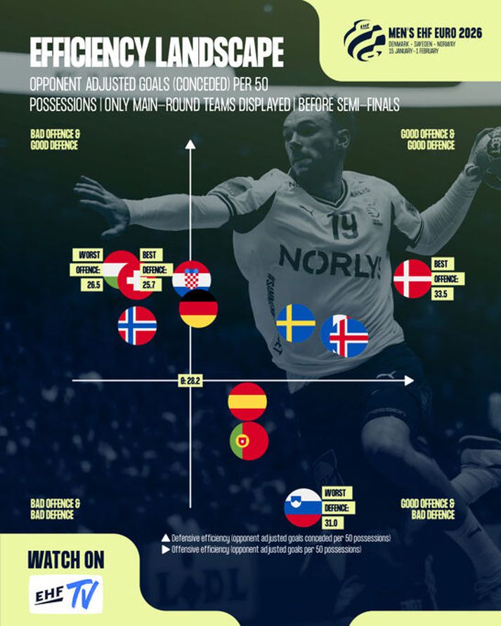 Strákarnir okkar hafa nefnilega verið næstbesta sóknarlið mótsins, samkvæmt þessari úttekt, og eina liðið sem slegið hefur þeim við er einmitt Danmörk. Julian Rux, sérfræðingur EHF, tók saman sóknarnýtingu liðanna á EM. Liðin spila auðvitað mishraðan handbolta og fá því mismargar sóknir, en í úttektinni skoðaði Rux hvernig liðin stæðu sig að meðaltali í hverjum 50 sóknum, svo samanburðurinn yrði sanngjarn. Þá aðlagaði hann niðurstöðuna út frá styrkleika mótherja liðanna hverju sinni, og tók svokallaðar „ruslmínútur“ í lok ójafnra leikja út. Niðurstaðan er sú að Ísland skorar 32 mörk úr 50 sóknum og er í næstefsta sæti. Aðeins Danmörk gerir betur, með 33,5 mörk. Myndin sýnir hvernig liðin standa sig í vörn og sókn. Lóðrétti ásinn sýnir frammistöðu í vörn en lárétti ásinni, frá vinstri til hægri, sýnir sóknarnýtinguna og þar er Ísland í 2. sæti.EHF Hin liðin í undanúrslitunum, Íslendingastýrðu lið Þýskalands og Króatíu, koma talsvert á eftir með um 28-29 mörk í 50 sóknum. Það sem gerir íslenska sóknarleikinn svo skilvirkan, segir Rux, er að liðið passar svo vel upp á boltann. Liðið tapar boltanum bara 7,2 sinnum miðað við 50 „aðlagaðar“ sóknir, aðeins þrjú lið tapa boltanum sjaldnar, og það er ekki sjálfgefið miðað við leikstíl liðsins. Þá er skotnýtingin góð eða 69,3%, rétt á eftir Slóveníu (70,6%) og Danmörku (71,9%) sem er efst. Janus Daði, Viggó, Ómar Ingi og Gísli eru meðal efstu manna þegar skotnýtingin hjá skyttum og miðjumönnum er skoðuð. Danir eiga þar tvo menn meðal þrettán efstu.EHF Íslenska vörnin í tíunda sæti Ísland stendur hins vegar verst undanúrslitaliðanna þegar sjónum er beint að varnarleiknum. Þar hjálpar auðvitað ekki til að hafa fengið á sig 38 mörk gegn Svisslendingum sem ekki unnu leik í milliriðlakeppninni. Íslenska vörnin er í 10. sæti á mótinu samkvæmt úttekt EHF, og fær á sig 27,2 mörk í 50 sóknum. Heims- og Ólympíumeistarar Danmerkur eru í 2. sæti með sína vörn sem fær á sig 25,9 mörk. Það er því, eins og öllum er svo sem ljóst, afar erfitt verkefni fram undan hjá strákunum okkar annað kvöld þegar í húfi verður fyrsti úrslitaleikur Íslands á Evrópumóti.