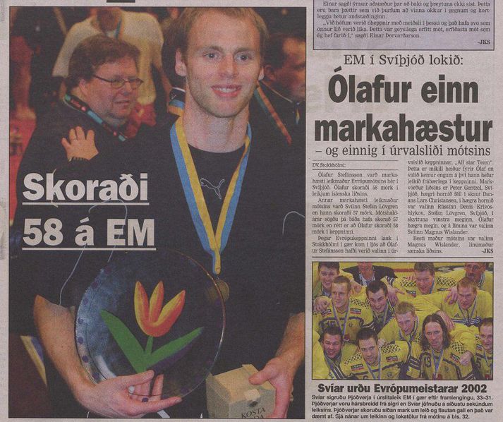 Gísli Þorgeir og allir hinir verðlaunastrákar sögunnar Óskar Ófeigur Jónsson skrifar 2. febrúar 2026 09:01 Ólafur Stefánsson og Guðjón Valur Sigurðsson hafa oftast komist í úrvalslið stórmóta en Gísli Þorgeir Kristjánsson komst þangað í fyrsta sinn á Evrópumótinu í ár. Vísir/VilhelmGetty/ Srdjan Stevanovic/timarit.is Gísli Þorgeir Kristjánsson varð fimmtándi fulltrúi Íslands í úrvalsliði stórmóts í handbolta karla þegar hann var valinn í úrvalslið Evrópumótsins í handbolta í gær. Aðeins níu aðrir íslenskir leikmenn hafa náð þessu. Ísland hafði áður átt sex fulltrúa í úrvalsliði Evrópumóts. Þar af áttu Ólafur Stefánsson (3) og Guðjón Valur Sigurðsson (2) fimm af þeim sex útnefningum en Viktor Gísli Hallgrímsson var sá síðasti á undan Gísla til að komast í úrvalslið EM. Viktor Gísli var í úrvalsliði EM fyrir fjórum árum. Það er enginn miskunn þótt að þú sért besti leikstjórnandi Evrópumótsins.Vísir/Vilhelm Gísli Þorgeir átti magnað Evrópumót og var potturinn og pannan í sóknarleik íslenska liðsins á mótinu. Hann er aðeins annar Íslendingurinn sem er valinn í úrvalslið sem leikstjórnandi og sá fyrsti í sautján og hálft ár eða síðan Snorri Steinn Guðjónsson var valinn í úrvalsliðið á Ólympíuleikunum í Peking 2008. Gísli endaði með 34 mörk og gaf flestar stoðsendingar allra á mótinu eða 62. Gísli kom alls að 96 mörkum með beinum hætti í leikjunum níu eða að meira en tíu mörkum í hverjum leik. Í tölfræði EM eru stoðsendingar bæði stoðsendingar og fiskuð víti sem gefa mörk en enginn fiskaði fleiri víti í mótinu en Gísli. Leikstjórnandi íslenska landsliðsins fiskaði alls 25 víti á þessu móti. Hér fyrir neðan má sjá yfirlit með öllum löndum Gísla sem hafa staðið sig svo vel á stórmóti með íslenska landsliðinu að þeir voru valdir í úrvalslið mótsins. Tímarit.is/Morgunblaðið HM í Svíþjóð 1993 Bjarki Sigurðsson, hægra horn Bjarki var fyrsti Íslendingurinn til að komast í úrvalslið á stórmóti þegar hann var valinn í hornið í úrvalsliði HM 1993. Ísland endaði í áttunda sæti á mótinu og vann aðeins þrjá af sjö leikjum sínum en Bjarki heillaði alla með frábærri frammistöðu sinni í hægra horninu. Valdimar Grímsson, einn markahæsti leikmaðurinn á Ólympíuleikunum ári áður, meiddist fyrir mótið og Bjarki kom sterkur inn í forföllum hans. Tímarit.is/Morgunblaðið HM á Íslandi 1995 Geir Sveinsson, lína Tveimur árum síðar átti Ísland aftur leikmann í úrvalsliði heimsmeistaramóts þegar landsliðsfyrirliðinn Geir Sveinsson var valinn á línuna í liðinu. Íslenska landsliðið olli miklum vonbrigðum og náði aðeins fjórtánda sæti á heimavelli en Geir sprakk úr sem sóknarmaður. Alltaf traustur í vörninni en þarna fór hann líka á kostum í sóknarleiknum, skoraði 26 mörk af línunni og nýttu 74 prósent skota sinna. Tímarit.is/Morgunblaðið HM í Kumamoto 1997 Valdimar Grímsson, hægra horn Ísland átti fulltrúa í úrvalsliðinu á þriðja heimsmeistaramótinu í röð þegar Valdimar var valinn í úrvalsliðið á HM í Japan 1997 þar sem íslenska liðið náði fimmta sætinu sem er enn besti árangur Íslands á heimsmeistaramótinu. Valdimar fór mikinn í hægra horninu og varð þriðji markahæsti leikmaður mótsins með 52 mörk, þar af 18 þeirra úr vítum. Íslenska liðið tapaði aðeins einum af níu leikjum sínum en það var eins marks tap á móti Ungverjum í átta liða úrslitum keppninnar. Timarit.is/Dagblaðið Vísir EM í Svíþjóð 2002 Ólafur Stefánsson, hægri skytta Ólafur varð markakóngur Evrópumótsins í Svíþjóð 2002 þar sem íslenska landsliðið komst í undanúrslit í fyrsta sinn á Evrópumóti og endaði að lokum í fjórða sætinu. Ólafur skoraði 58 mörk og nýtti 54 prósent skota sinna í leikjunum átta en framlag hans lá ekki síst í fjölmörgum stoðsendingum á liðsfélagana. Ólafur varð skráður með 37 stoðsendingar hjá mótshöldurum og kom því samtals að 95 mörkum eða 11,9 að meðaltali í leik sem var það mesta á öllu Evrópumótinu. EPA/REGINA KUEHNE EM í Sviss 2006 Ólafur Stefánsson, hægri skytta Ólafur varð fyrstur Íslendinga til að komast tvisvar sinnum í úrvalslið á stórmóti þegar hann var valinn í úrvalsliðið á Evrópumótinu 2006. Ólafur spilaði frábærlega á mótinu en hann missti af tveimur leikjum, leik tvö og þrjú, eftir að hafa fengið að kenna á því hjá Serbum í fyrsta leik. Ólafur skoraði 33 mörk í fjórum leikjum eða 8,3 að meðaltali í leik og íslenska liðið náði sjöunda sæti. Ólafur var einnig skráður með sautján stoðsendingar og kom því með beinum hætti að 12,5 mörkum í leik. Getty/Vladimir Ry Ólympíuleikar í Peking 2008 ÓL 2008 Ólafur Stefánsson, hægri skytta ÓL 2008 Snorri Steinn Guðjónsson, leikstjórnandi ÓL 2008 Guðjón Valur Sigurðsson, vinstra horn Ísland átti þrjá fulltrúa í úrvalsliði Ólympíuleikanna í Peking 2008 þar sem íslenska landsliðið náði sínum besta árangri frá upphafi á stórmóti. Í fyrsta og eina skiptið komust strákarnir okkar alla leið í úrslitaleikinn þar sem liðið varð að sætta sig við tap á móti Frökkum. Söguleg frammistaða skilaði silfurverðlaunum sem var í fyrsta sinn sem svo fámenn þjóð vinnur verðlaun í liðakeppni á Ólympíuleikum. Þarna voru þeir Ólafur Stefánsson, Snorri Steinn Guðjónsson og Guðjón Valur Sigurðsson heldur betur í essinu sínu og sáu til þess að Ísland átti þrjá af sjö leikmönnum úrvalsliðsins. Ólafur var fyrirliði og leiðtogi liðsins en hann fékk menn til að trúa á það að ná verðlaunum. Hann var þarna í úrvalsliðinu í þriðja sinn á ferlinum eftir að hafa skilað 29 mörkum og 38 stoðsend