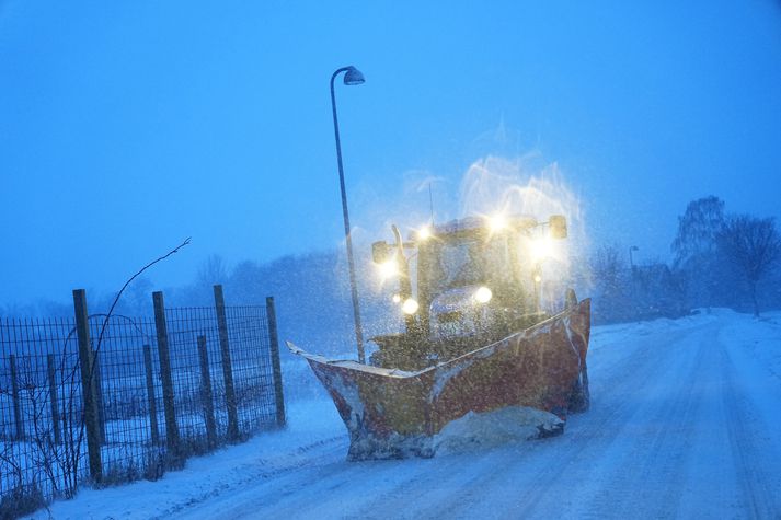 Danskir fréttamiðlar loga með gulum og rauðum borðum vegna snjókomunnar sem gert er ráð fyrir að haldi áfram í dag og í kvöld. Allnokkur snjór féll í gær og í nótt og danska veðurstofan varar við snjóstormi í stórum hluta landsins fram eftir degi í dag, einkum á Norður-Jótlandi. Samkvæmt upplýsingum sem DR hefur eftir Veðurstofu Danmerkur er nú um 17 sentímetra djúpur snjór í höfuðborginni Kaupmannahöfn, sem er það mesta sem mælst hefur síðan 2011. Hins vegar sýni gögn veðurstofunnar að ekki hafi sést eins umfangsmikil snjókoma í borginni í fimmtán ár, þegar litið er til þess hve mikið snjómagn hefur aukist milli daga. Í gær mældist snjórinn 2,5 sentímetra djúpur en í dag 17,1 sentímetrar, sem gerir aukningu upp á 14,6 sentímetra. Snjómokstur í fullum gangi við Baarse.EPA/Mads Claus Rasmussen Víða sitja bílar fastir, strætisvagnar hafa hafnað utanvegar og nokkuð um aflýstar ferðir eða önnur áhrif á almenningssamgöngur, meðal annars á innanlandsflug. Þá hefur verið varað við því að veðrið gæti haft áhrif á millilandaflug frá Kaupmannahöfn, einkum í kvöld og í nótt. Skólastarf hefur verið fellt niður á einhverjum stöðum um landið, og þeir sem geta hafa verið hvattir til að vinna heima í dag. Lögreglan hefur ráðið fólki frá því að halda af stað út í umferðina að nauðsynjalausu í umdæmum lögreglunnar á Norður- og Suður-Sjálandi, Austur-Jótlandi og í norðurhluta Suðaustur-Jótlands. Hins vegar nær vetrarveðrið að einhverju marki til allra landshluta og ráðleggur embætti ríkislögreglustjóra öllum að fylgjast vel með færð og veðri áður en lagt er af stað, sama hvar það er á landinu. Þessi strætó hafnaði á vegriði og lenti útaf veginum. EPA/Mads Claus Rasmussen