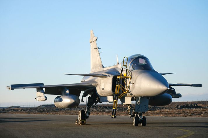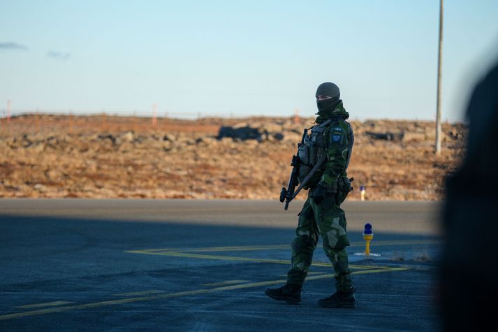 Rúmlega hundrað sænskir hermenn eru hér á landi í tengslum við loftrýmisgæsluna og sex orrustuþotur sinna loftrýmisgæslunni sjálfri. Vélarnar sem flugsveitin er með hér á landi eru af gerðinni Jas Gripen og eru þær meðal annars útbúnar sjálfvirkum byssum sem og róbótum. „Þetta er fjölnota herþota sem getur elt uppi skotmörk og sinnt eftirliti, það er, sinnt hlutverki sínu í háloftunum en einnig gert árásir á skotmörk á sjó og á jörðu,“ sagði Johan Legardt í yfirliðsforingi í sænska flughernum í viðtali sem birtist í kvöldfréttum Sýnar. Hverjar eru mögulegar ógnir í íslenskri lofthelgi? „Ógnin sem við sjáum hér eru rússneskar sprengjuflugvélar. Ísland er fremur einangrað samanborið við Rússland og því þarf langdrægni og eldsneytisáfyllingu í háloftunum. Sprengjuflugvélar er ógnin sem við sjáum hér,“ bætir Johan við. Sænski herinn sinnir loftrýmisgæslunni. Vísir/Anton Brink Hann segist eftirláta stjórnmálamönnum að tjá sig um spennuna í Norður-Atlantshafi síðustu vikurnar. Með verkefninu sé verið að senda skilaboð til Rússa og þó staðan í háloftunum sé róleg fara vélarnar samt sem áður í loftið. „Við æfum mikið á hverjum degi. Þó það sé ekkert hættulegt verkefni með rússneskum sprengjuflugvélum þá æfum við okkur í íslenskri lofthelgi.“ Hissa á veðrinu Eruð þið ánægðir með veðrið sem Ísland hefur boðið ykkur upp á? „Við erum einstaklega ánægðir með veðrið og mjög hissa yfir því hversu gott það hefur verið hingað til,“ segir hann brosandi. Svíþjóð gekk í NATO fyrir tæpum tveimur árum og segir Johan mikilvægt fyrir Svía að leggja sitt af mörkum innan bandalagsins. Loftrýmisgæsla frá Svíþjóð, Nato, sænski herinn, Keflavíkurflugvöllur, varnarsvæðiVísir/Anton Brink „Ísland sem hefur verið með í NATO síðan 1949 veit hvað bandalagið er mikilvægt en við sem nýir meðlimir erum mjög stoltir yfir að geta lagt svona mikið af mörkum snemma í ferlinu.“ Hvernig hafa móttökurnar verið á Íslandi? „Okkur hefur verið tekið opnum örumum og þetta hefur allt gengið mjög vel. Við erum mjög ánægðir.“