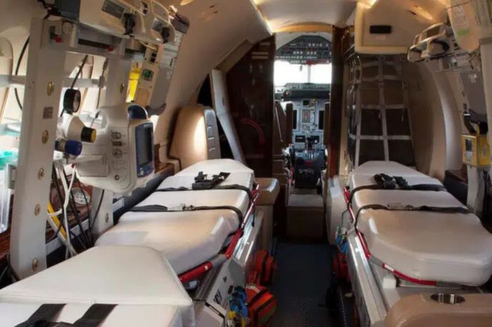 Agnar Jónsson, vinur Kjartans, segir ferðalagið hafa gengið vel og að líðan Kjartans sé eftir atvikum góð. Sjúkraþota lagði af stað frá Billund á miðvikudaginn og hafði viðkomu í Hurghada í Egyptalandi og Naíróbí í Kenía á leið sinni til Jóhannesarborgar og flaug sömu leið til baka. Flugvélin lenti í Keflavík snemma í morgun. Innan í sjúkraflugvélinni sem Kjartan flaug í heim.JETVIP Agnar segir að Kjartan hafi verið fluttur á gjörgæsludeild borgarspítalans þar sem hann verður skoðaður og framhaldið metið. „Hann er kominn heim til Íslands. Enginn átti von á því að hann næði því yfirhöfuð. Líkurnar voru ekki með honum,“ segir Agnar.