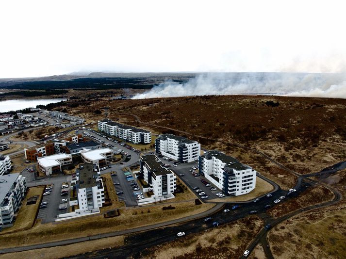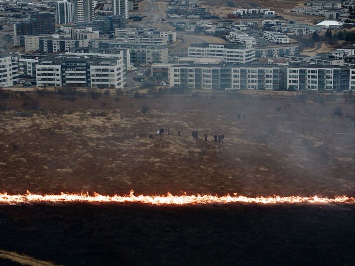 Fyrst um sinn var einn dælubíll sendur á vettvang og talið að hægt væri að ráða niðurlögum eldsins. Hins vegar tók eldurinn að dreifa sér og sést reykurinn út um allt höfuðborgarsvæðið. Sjúkraflutningamenn eru einnig á vettvangi. Allt tiltækt lið hefur verið boðað út samkvæmt slökkviliðinu. Þeir eru samt sem áður bjartsýnir. Fólk er farið að hætta sér ansi nálægt eldinum.Vísir/Vilhelm „Við erum ekki alveg að ná að hemja þetta,“ segir varðstjóri. Samkvæmt sjónarvotti er sinueldurinn orðinn um kílómetra langur og teygir sig í átt að hinum sögufræga útivistarsvæði Guðmundarlundi. Slökkviliðið staðfesetir að tungan sé sirka kílómetrs löng. Mikið umferðaöngþveiti er á svæðinu vegna forvitinna vegfaranda og eiga viðbragðsaðilar erfitt með að komast að. Fólk stendur þá ansi nálægt eldinum. Samkvæmt ábendingu til fréttastofu hefur lögreglan lokað fyrir umferð um Flóttamannaleiðina vegna eldsins. Myndir frá lesendum Vísis sýna að reykurinn sést alla leið vestur í bæ að Háskóla Íslands og þá finnst lykt af eldinum alla leið að álverinu í Hafnarfirði. Dreifst hefur mikið úr eldinum á skömmum tíma miðað við ljósmyndir af vettvangi. Eldurinn nálgast Elliðavatnið.Vísir/Vilhelm Alls hefur slökkviliðið farið í fimm útköll á rétt rúmum sólarhring vegna sinuelda víðs vegar á höfuðborgarsvæðinu. Fólk er farið að hætta sér ansi nálægt eldinum.Vísir/Vilhelm Á svipuðum tíma í gær kom upp eldur á Kjalarnesi og í nótt kviknaði sinueldur bæði í Norðlingaholti og við Vífilsstaðavatn í Garðabæ. Fyrr í dag kviknaði eldur á Reykjavíkurflugvelli. Reykurinn sést víða.Vísir/Brynjar Freyr Fréttin hefur verið uppfærð.