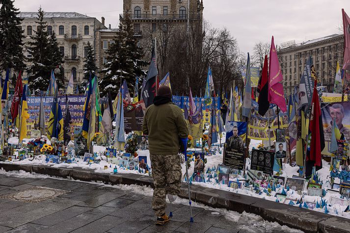 Þá mun hún einnig funda með Vólódimír Selenskí Úkraínuforseta ásamt leiðtogum hinna Norðurlandanna og Eystrasaltsríkjanna, auk þess sem hún mun sækja fund „hinna viljugu“, það er að segja bandamanna Úkraínu. Ferðalag Kristrúnar og fylgdarliðs hófst með næturfluti til Varsjár, þar sem við tók bið í sendiráðinu. Þá var lagt í nokkurra klukkustunda bílferð að landamærum Póllands og Úkraínu, þar sem enn var beðið. Ferðalaginu lauk með næturlest til Kænugarðs. Úkraínumenn minnast látnu nú þegar fjögur ár eru liðin frá því að Rússar réðust inn í landið.Getty/Diego Fedele Að sögn blaðamanns Sýnar sem staddur er í Kænugarði er mikill viðbúnaður þar vegna fjölda erlendra þjóðarleiðtoga í borginni. Á leiðinni í gegnum borgina frá lestarstöðinni mátti sjá lögregluþjóna við hver gatnamót til að tryggja að bílalest Kristrúnar kæmist sinnar leiðar. Þá mátti á víð og dreif sjá minnisvarða um það ástand sem íbúar hafa búið við síðustu ár; ónýta skriðdreka og brak úr drónum. Einnig blasti við gríðarstór veggur, þakinn myndum af þeim sem hafa látist sökum stríðsins.