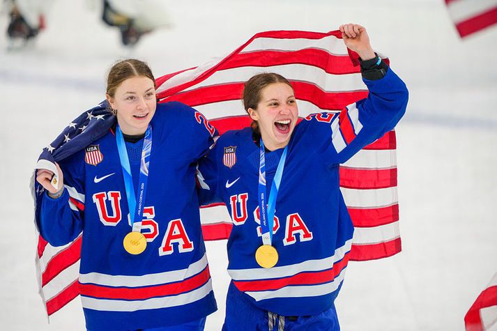 Trump hringdi í karlaliðið þegar það var enn að fagna Ólympíumeistaratitlinum inni í búningsklefa á sunnudaginn, eftir sigur gegn Kanada í framlengdum leik. Þar bauð hann liðinu að vera viðstatt þegar hann flytur árlegt ávarp sitt til þingsins í kvöld, um stöðu ríkjasambandsins (e. The State of the Union). Ljóst er að leikmönnum þótti þetta mikill heiður og þeir tóku vel í boðið í símtalinu. En í símtalinu gaf Trump einnig í skyn að hann neyddist til þess að bjóða kvennalandsliðinu líka. Það varð einnig Ólympíumeistari, með nákvæmlega sama hætti og karlaliðið því það vann Kanada í framlengdum úrslitaleik. „Ég verð að segja ykkur að við verðum að bjóða kvennaliðinu,“ sagði hinn 79 ára gamli Trump og hló. „Þið vitið það. Ég held að ég yrði líklega kærður til embættismissis [ef kvennaliðinu yrði ekki boðið],“ bætti Trump við og áfram var hlegið. You can hear the genuine pride in Donald Trumps voice when he called the Team USA Hockey Team pic.twitter.com/ch6GbXShwh— Harrison Krank (@HarrisonKrank) February 23, 2026 Í yfirlýsingu frá kvennalandsliðinu er hvergi vísað í þetta grín forsetans heldur er boðinu hafnað með afar kurteisum hætti. „Við erum innilega þakklátar fyrir boðið sem gullverðlaunaliði Bandaríkjanna í íshokkí kvenna var sent og kunnum vel að meta viðurkenninguna á einstökum árangri liðsins,“ sagði í yfirlýsingu frá bandaríska kvennaliðinu sem gefin var út í gær. Aerin Frankel og Hannah Bilka verða ekki viðstaddar ræðu forsetans í kvöld.Getty Samkvæmt AP fréttaveitunni fengu landsliðskonurnar, sem unnu sinn titil síðasta fimmtudag, ekki að vita af boðinu fyrr en í fyrrakvöld og áttu þá orðið erfitt með að breyta sínum plönum. Á meðan að karlaliðið ferðaðist í einkaflugi til Miami í gærmorgun fóru konurnar með áætlunarflugi til Atlanta. „Vegna tímasetningar og áður ákveðinna náms- og starfsskuldbindinga í kjölfar leikanna geta íþróttakonurnar ekki tekið þátt. Þeim þótti heiður að vera boðið og eru þakklátar fyrir viðurkenninguna,“ sagði einnig í yfirlýsingu kvennaliðsins.