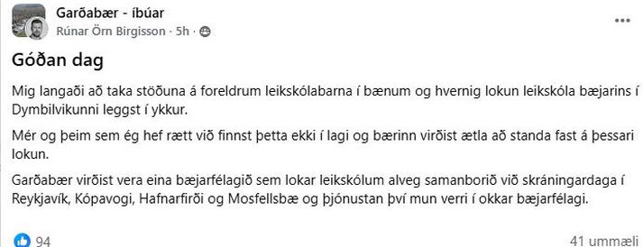 Dymbilvikan er gengin í garð en hún hefur valdið foreldrum í Garðabæ talsverðum höfuðverk. Leikskólar í bænum eru lokaðir alla vikuna en það er í kjölfar breytinga sem voru samþykktar haustið 2023 og var ætlað að bæta starfsumhverfi leikskóla í Garðabæ. Rúnar Örn Birgisson birti í dag færslu í Facebook-hópnum Garðabær – íbúar þar sem hann segist ekki hrifinn af þessari útfærslu bæjarins og óskar eftir því að fá álit fleiri foreldra sem eru með börn á leikskóla í Garðabæ. Ummæli fjölmargra hafa safnast undir færslunni og eru þar langflestir á sama máli og Rúnar. Foreldrar í Garðabæ virðast flestir sammála Rúnari Erni Birsgissyni en hann er ekki sáttur við lokanir leikskóla í Garðabæ.Skjáskot/Facebook Meðal þeirra sem kusu að tjá sig um málið voru Þorbjörg Þorvaldsdóttir, bæjarfulltrúi Garðabæjarlistans, sem er í minnihluta. Hún skrifar ummæli við færsluna þar sem hún vitnar í bókun sína sem hún lagði fram við samþykkt tillögunnar haustið 2023. „Við vonum svo sannarlega að tillögurnar skili tilætluðum árangri: Færri lokunum vegna manneklu, fleira starfsfólki á leikskólunum og þar með öruggari þjónustu fyrir fjölskyldur í bænum,“ eru lokaorð bókunarinnar. Þorbjörg Þorvaldsdóttir er bæjarfulltrúi Garðabæjarlistans.Aðsent Í samtali við fréttastofu segir Þorbjörg að hún standi við það að breytingarnar hafi verið til þess hugsaðar að létta á leikskólastarfsfólki en hún segir jafnframt að tryggja þurfi eftirfylgni með breytingunum og endurskoðun ef þörf er á. „Það var gerð könnun sem kom ágætlega út en mér hefur samt fundist vanta upp á eftirfylgni, til dæmis þarf að komast að því hvernig breytingarnar eru að virka fyrir einstæða foreldra og fólk sem starfar á vettvangi þar sem er erfitt að komast frá vinnu.“ „Það var rosalega skýrt ákall frá starfsfólki leikskólanna,“ Þorbjörg bætir við að hún telji breytinguna hafa haft góð áhrif á starfsfólk. Leikskólar í Reykjavík opnir Sum ummælanna kváðu á um að skólar í Reykjavík væru lokaðir alla vikuna, líkt og í Garðabæ. Hjördís Rut Sigurjónsdóttir, upplýsingafulltrúi á Skóla- og frístundasviði Reykjavíkurborgar, segir svo ekki vera. „Þessu er þannig háttað í Reykjavík að í skólum sem reknir eru af borginni eru svokallaðir skráningardagar í vikunni. Þar geta foreldrar ákveðið hvort þeir sendi börnin á leikskólann þessa tilteknu daga en því fylgir svo dagsgjald,“ segir Hjördís. Hún segir þó að sjálfstætt starfandi leikskólar geti haft þetta öðruvísi ef þeir telji ástæðu til en það sé þá gert í samtali við þann hóp foreldra sem sækir þaðan þjónustu. Skortur á starfsfólki Almar Guðmundsson, bæjarstjóri Garðabæjar, segir að ágætis sátt hafi náðst um breytingarnar. „Við vorum að bregðast við stöðu þar sem var verið að keppast um starfsfólkið en það var of mikið álag á leikskólunum og við sáum það í veikindafjarveru og svoleiðis,“ segir Almar. Hann segir Viðskiptaráð hafa kannað stöðuna og að það hafi komist að því að minnstar lokanir séu í Garðabæ. „Á sumrin getur fólk valið hvaða vikur það vill hafa í sumarfrí, leikskólarnir loka ekki,“ segir Almar. Hann segist að lokum fullum fetum „að þegar á heildina sé litið standi Garðabær mjög framarlega, umræða meðal foreldra sé eðlileg en þetta hafi þurft til að allt sé sanngjarnt“.