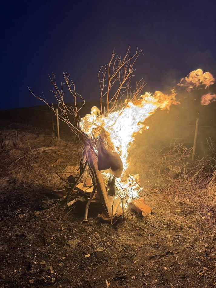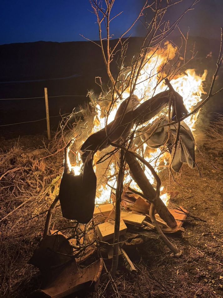 Sigurður bjó til lítinn bálköst og kom fötunum þar fyrir.