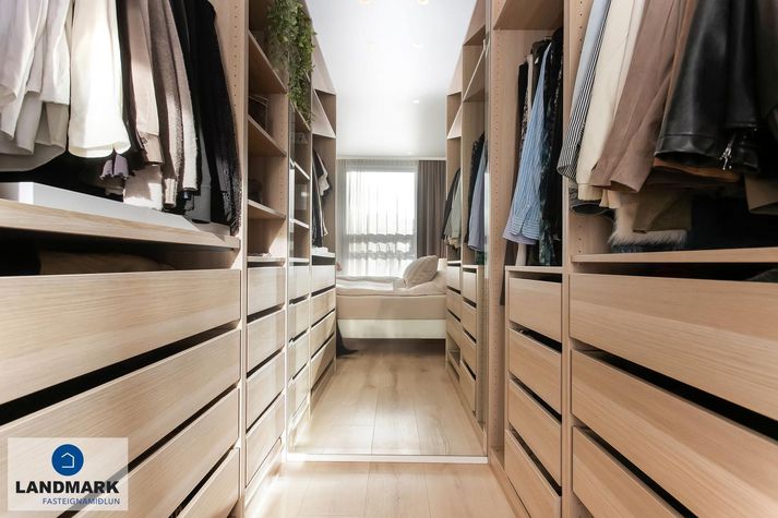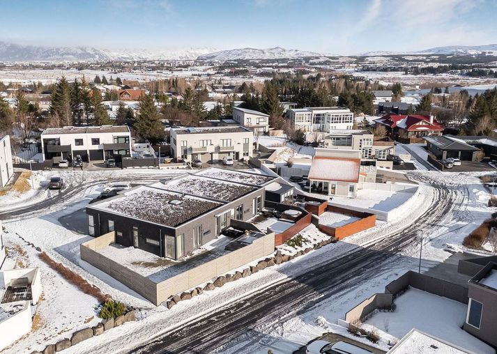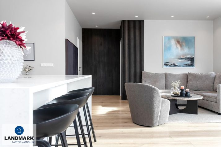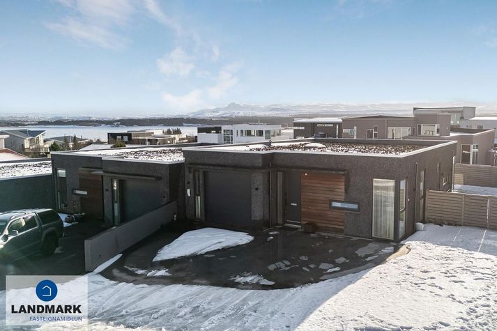 Um er að ræða 114 fermetra endaraðhús, byggt árið 2017, með þremur svefnherbergjum og þrjátíu fermetra bílskúr. Frá stofu er gengið út á rúmlega hundrað fermetra timburpall með heitum potti og fyrir framan er steypt upphitað bílaplan.