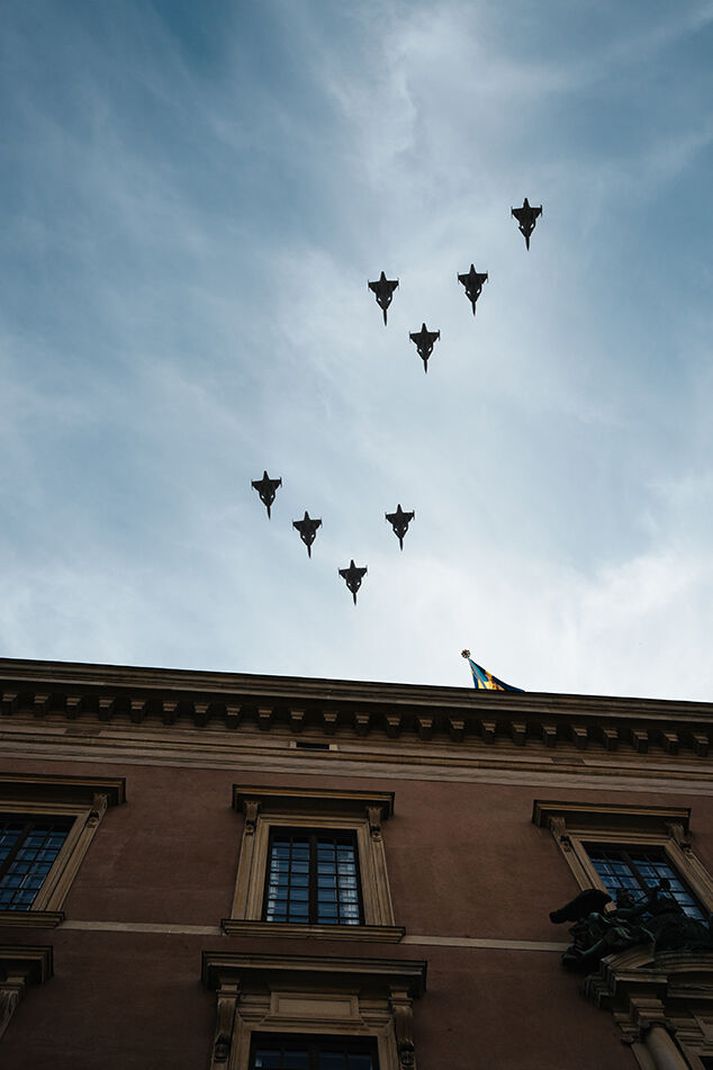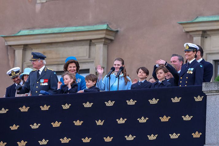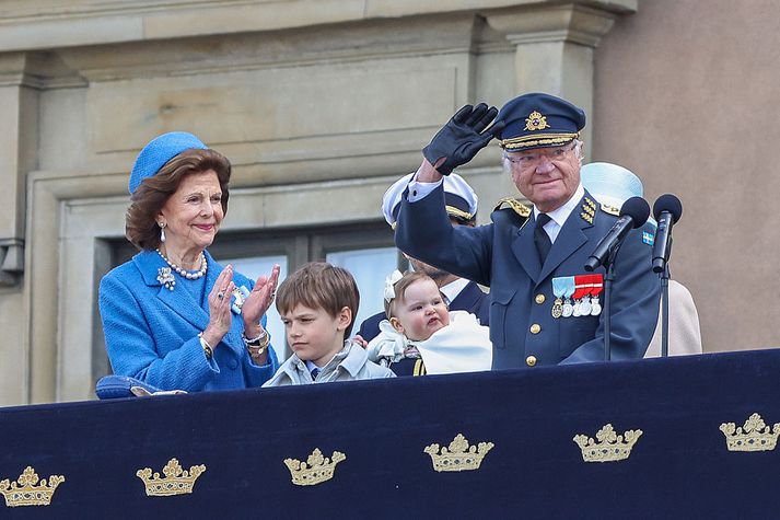 Karl Gústaf varð þjóðhöfðingi Svíþjóðar árið 1973 og er sá konungur sem lengst hefur setið í því embætti þar í landi. Hann tók við embætti þegar afi hans lést en faðir Karls hafði látist í flugslysi þegar Karl var aðeins nokkurra mánaða gamalla. Karl og Sylvía drottning hafa verið gift frá árinu 1976 og eiga þau þrjú börn, krónprinsessuna Viktoríu fædda árið 1977, Karl Filippus sem fæddur er 1979 og Magdalenu fædda árið 1982. Þá eiga þau Karl Gústaf og Sylvía níu barnabörn. Karl Gústaf og Sylvía ásamt börnum sínum og barnabörnum en lengst til hægri er Viktoría krónprinsessa.Vísir/Getty Veisluhöldin í Stokkhólmi hófust snemma í morgun. Sænska þjóðfánanum var flaggað klukkan átta um morguninn og fyrir hádegið var öll konungsfjölskyldan viðstödd guðsþjónustu í Slottskyrkan þar sem Halla Tómasdóttir forseti Íslands og maki hennar Björn Skúlason voru viðstödd ásamt þjóðhöfðingjum hinna Norðurlandanna. Halla Tómasdóttir forseti Íslands og Björn Skulason maki hennar voru viðstödd guðsþjónustu í Slottskyrkan í morgun.Kungahuset Hefð er fyrir því að sænski herinn heiðri forsetann í hallargarðinum á afmælisdaginn og þar hafði mikill fjöldi fólks safnast saman til að hylla konunginn. JAS-herþotur flughersins flugu yfir og fylgdist Karl Gústaf glaður með af svölum hallarinnar ásamt allri konungsfjölskyldunni. Hermenn sænska hersins hylltu Karl Svíakonung í morgun.Kungahuset Í kjölfarið afhentu börn konungnum blóm og nú eftir hádegið var á dagskrá hádegisverður í boði borgarráðs Stokkhólms og loks hátíðarkvöldverður í konungshöllinni í kvöld. Börn afhentu konungnum blóm.Vísir/Getty Karli Gústafi var fagnað á svölum konungshallarinnar í morgun ásamt fjölskyldu sinni.Vísir/Getty Halla Tómasdóttir sést hér á mynd ásamt meðal annars Friðriki Danakonungi og Alexander Stubb forseta Finnlands.Kungahuset JAS-herþotur flugu yfir konungshöllina.Vísir/Getty